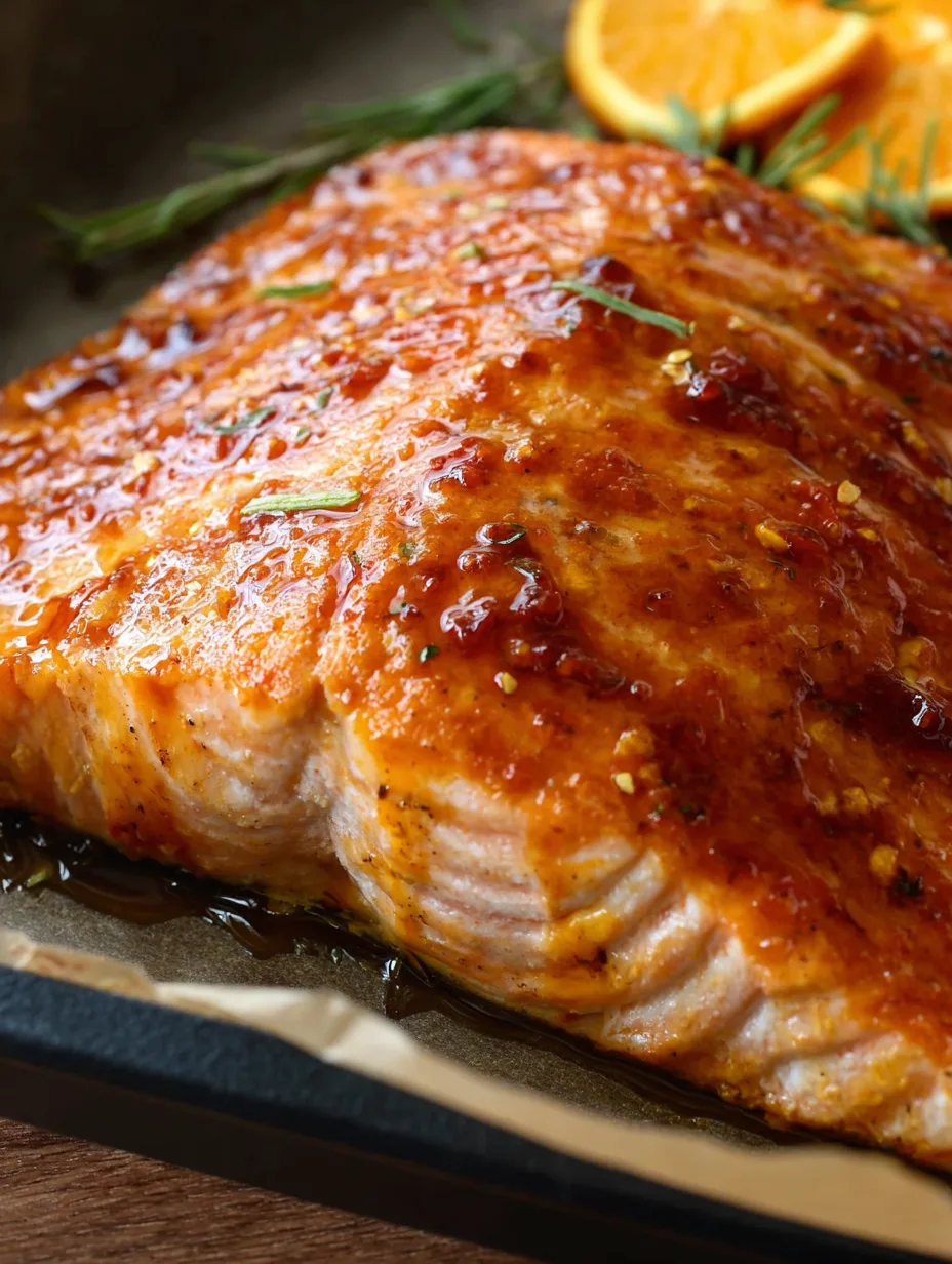 Remove the salmon and let it rest for 2 minutes. Spoon any remaining glaze from the baking dish over the top. The final result should be glossy, fragrant, and beautifully fork-tender.