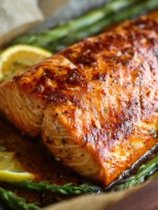 Preheat the oven to 400°F (200°C). Place the salmon in the center rack and bake for 12–15 minutes depending on thickness. The glaze will bubble and caramelize, and the salmon will turn opaque and flaky. For extra color, broil for the final 1–2 minutes, watching closely to avoid burning the honey.