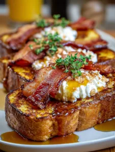Plate french toast, top with crispy bacon, and drizzle generously with warm syrup. Serve immediately for the best texture.