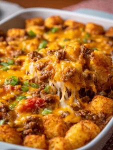 Place the dish in the oven and bake for 35–40 minutes. The tater tots should turn golden brown and crispy, while the filling bubbles underneath.