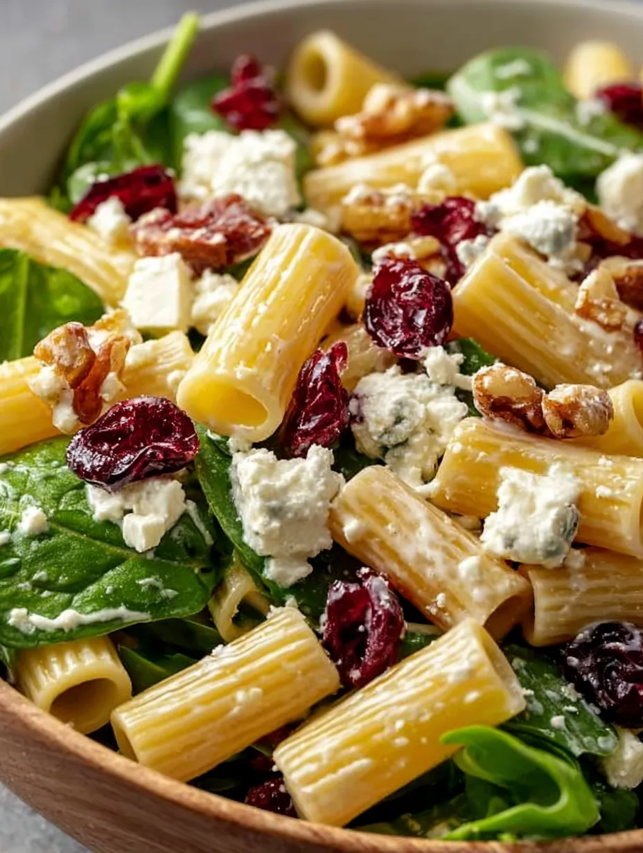 Creamy Feta and Cranberry Rigatoni Salad Tossed in Zesty Lemon Vinaigrette Dressing