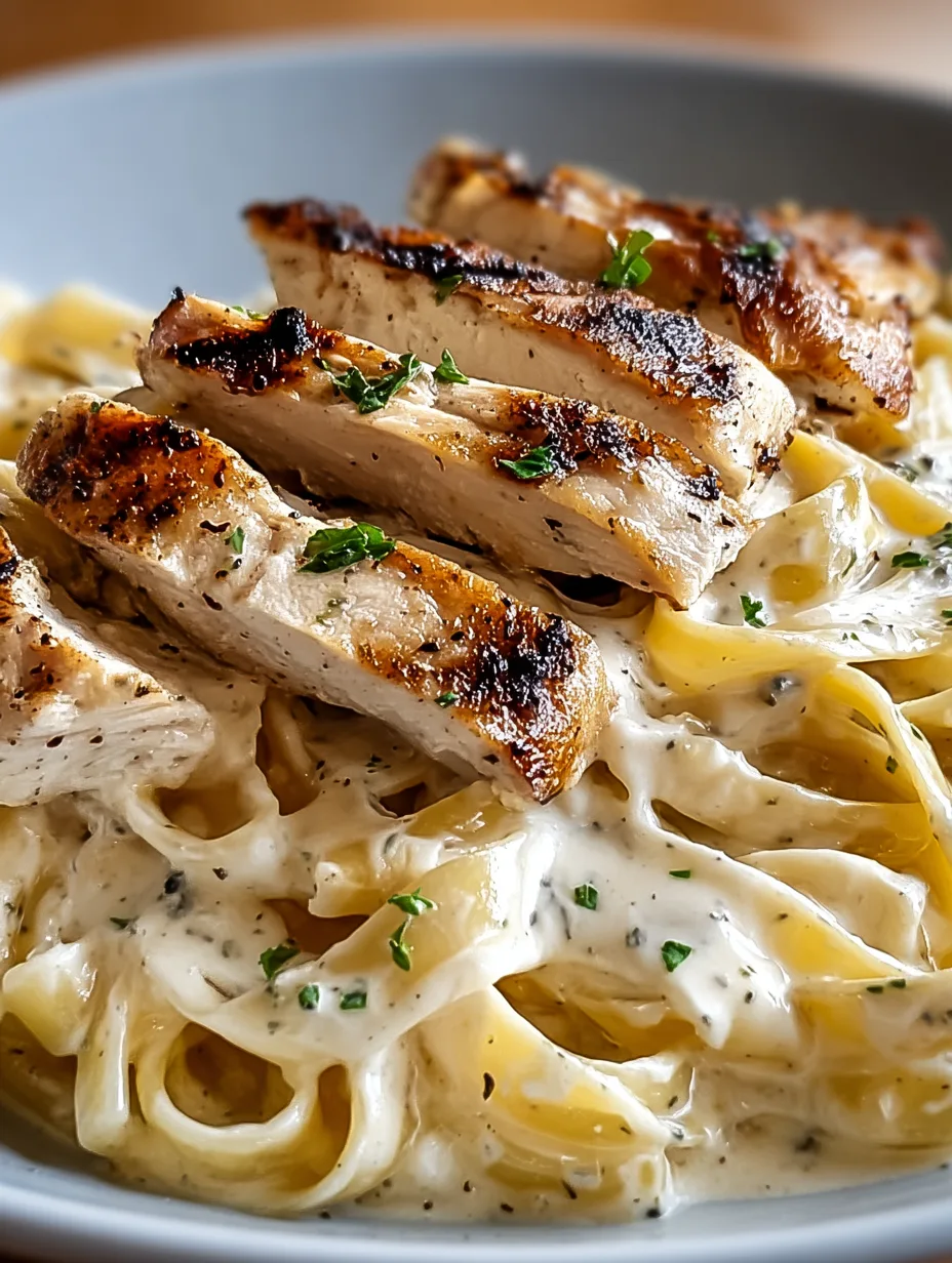 Gradually whisk in Parmesan cheese until fully melted. Season with salt and pepper. Add the cooked fettuccine, tossing gently to coat each strand with creamy goodness. Slice the grilled chicken and arrange on top. Garnish with fresh parsley and extra Parmesan if desired.