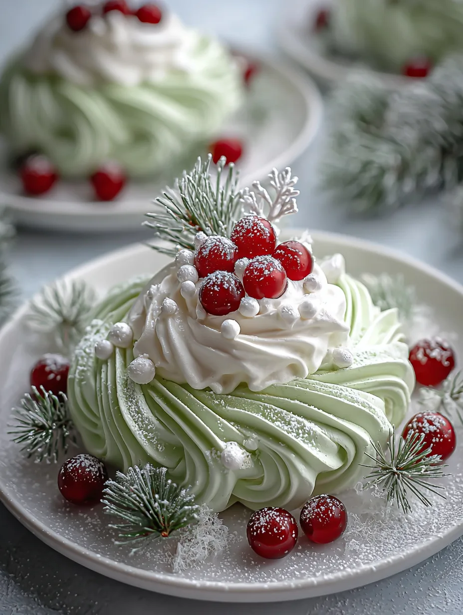 Carefully peel meringues off the parchment. Pipe whipped cream onto the top or in the center of each wreath. Arrange fresh berries over the cream, alternating colors for a festive look. Add optional mint leaves or edible glitter for extra flair.