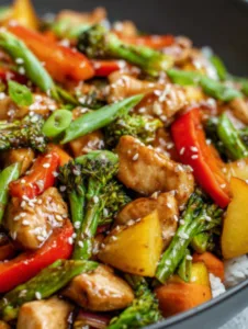 The chicken stays tender thanks to the cornstarch coating, while the vegetables add color, crunch, and freshness.