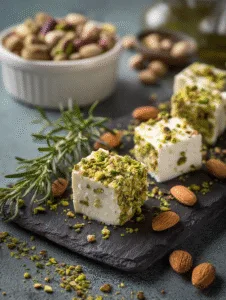 • Place a brie cube in the center and sprinkle generously with the pistachio-rosemary mixture.