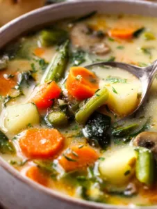 Unlike heavier winter soups, this one feels light, colorful, and energizing. Crisp carrots, tender peas, green beans, and baby potatoes create beautiful texture contrasts in every bite. It’s quick enough for a weekday dinner yet elegant enough for a weekend lunch with family.