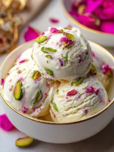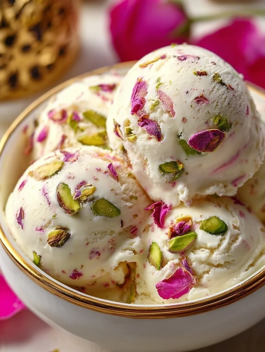 Store Floral Pistachio Rose Ice Cream in an airtight container in the freezer for up to two weeks. Press parchment paper directly on the surface to prevent ice crystals. For serving, let it sit at room temperature for 5 minutes to soften. Serve in chilled bowls, garnish with crushed pistachios, or pair with shortbread cookies. It also shines alongside fresh berries for a refreshing contrast.