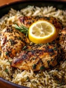Lemon Herb Chicken and Rice is a harmonious blend of textures and flavors. The chicken comes out juicy and tender with a golden sear, while the rice absorbs the lemony, herb-infused juices for a soft, buttery finish. The combination of garlic, thyme, rosemary, and parsley gives each bite a fresh, aromatic punch. The recipe is incredibly versatile—you can prepare it on the stovetop, in the oven, or even in a slow cooker. Its simplicity doesn’t sacrifice flavor, and it’s a one-pan meal that minimizes cleanup. Crunchy edges on the rice contrast with the soft chicken interior, giving you a satisfying bite every time. This is comfort food elevated, with a bright, fresh twist that makes it perfect for spring, summer, or year-round enjoyment.