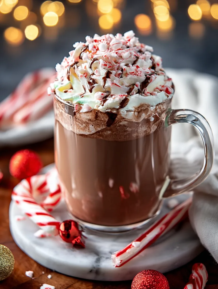 Whisk vigorously for 20–30 seconds to aerate and create foam. Pour into mugs, top with whipped cream, and sprinkle crushed peppermint candies for a festive finish. Serve immediately while hot and creamy.