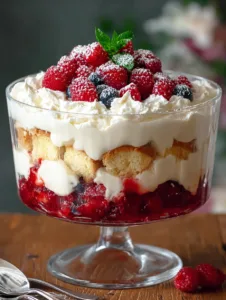 Texture makes this recipe shine. Soft cake layers absorb sparkling wine, while plump berries add bursts of freshness. The custard creates a silky middle layer, and whipped cream finishes everything with airy richness. Every bite feels balanced, not overly sweet.