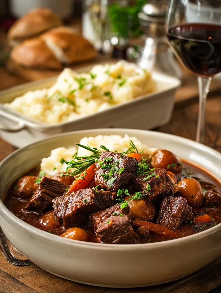 Slow Cooked Perfection: Beef becomes fall-apart tender in red wine sauce.