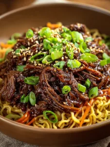 Finish Slow Cooker Korean Beef Nodes with sliced green onions and sesame seeds. Serve hot and enjoy the rich aroma and glossy finish.