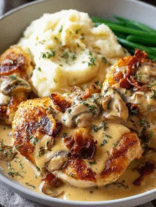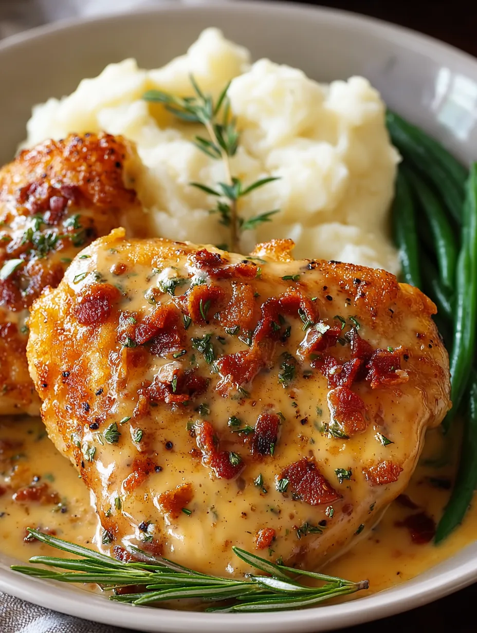 Return chicken and chopped bacon to the skillet. Spoon the gravy over the top, cover partially, and simmer 10–15 minutes until the chicken reaches 165°F.