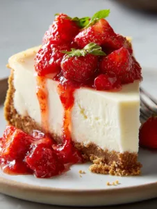 Once chilled, remove the cheesecake from the springform pan and spread the strawberry topping evenly over the surface. Garnish with whole strawberries or mint leaves for a visually stunning presentation.