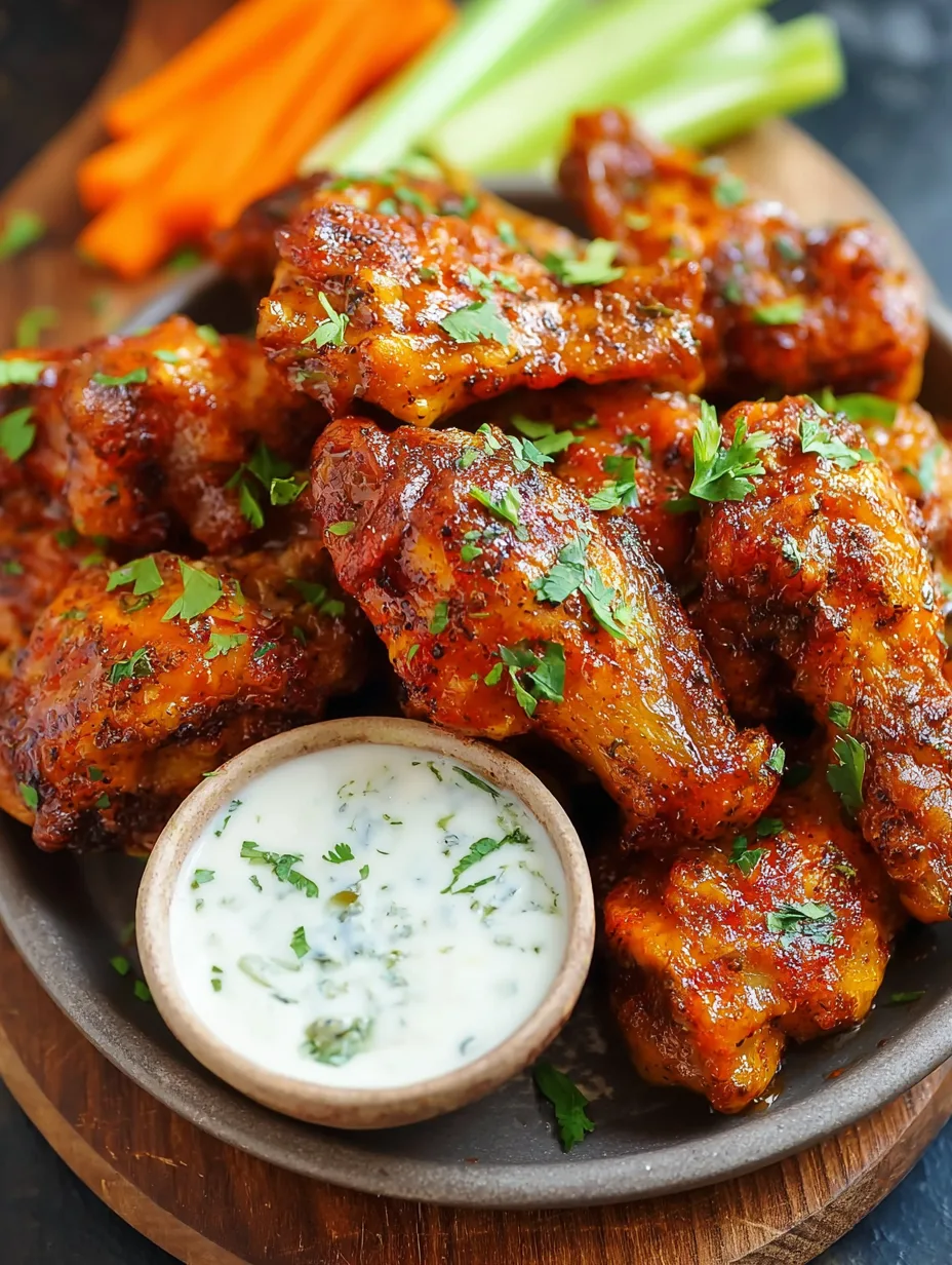 Store leftover wings in an airtight container in the refrigerator for up to 3 days. Reheat in the oven at 375°F (190°C) for 8–10 minutes to maintain crispiness. Blue cheese dip can be stored separately in the fridge for up to 2 days. Serve wings with celery sticks, carrot sticks, or a side of crispy fries for a complete snack or meal. They also pair well with a cold beer or a sparkling soft drink for game nights.