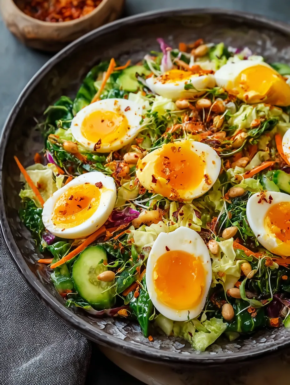 3. Dressing Matters: Whisk the rice vinegar, soy sauce, sesame oil, and sugar together until smooth. Toss the salad just before serving to avoid soggy leaves. A drizzle of dressing on the eggs enhances the flavor without overpowering the crunch.